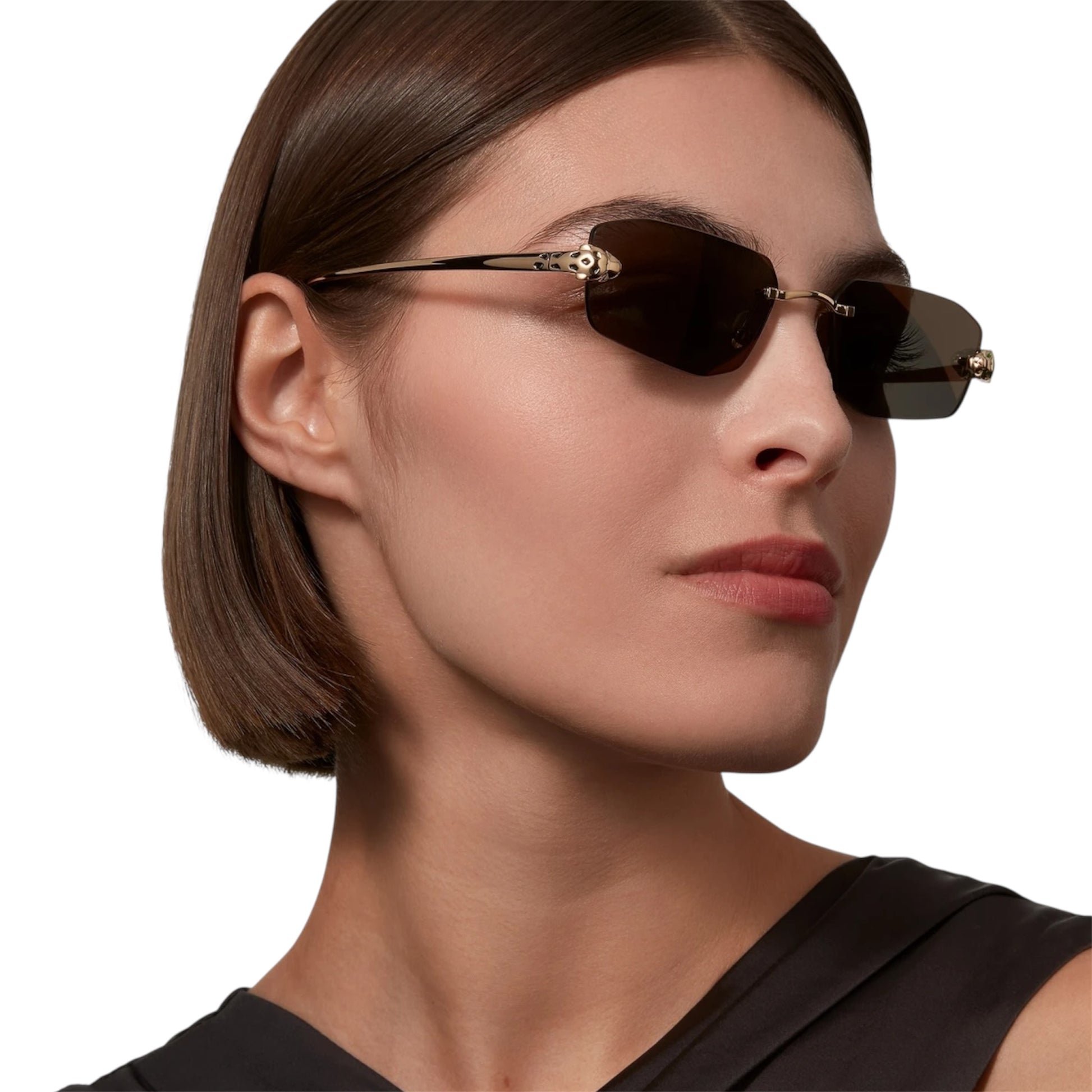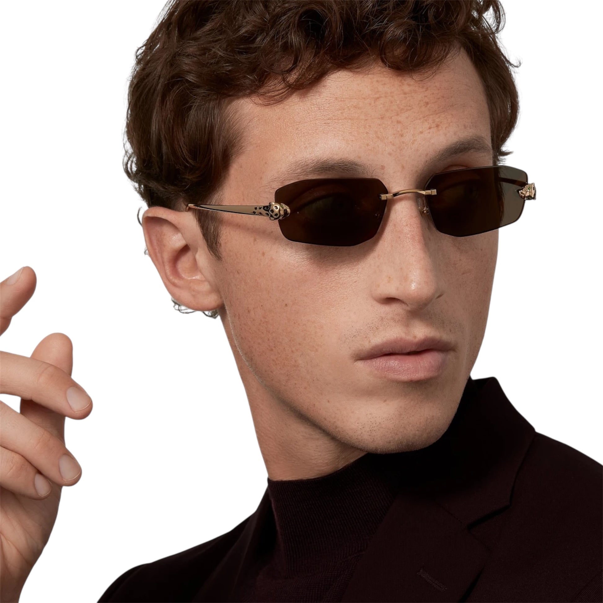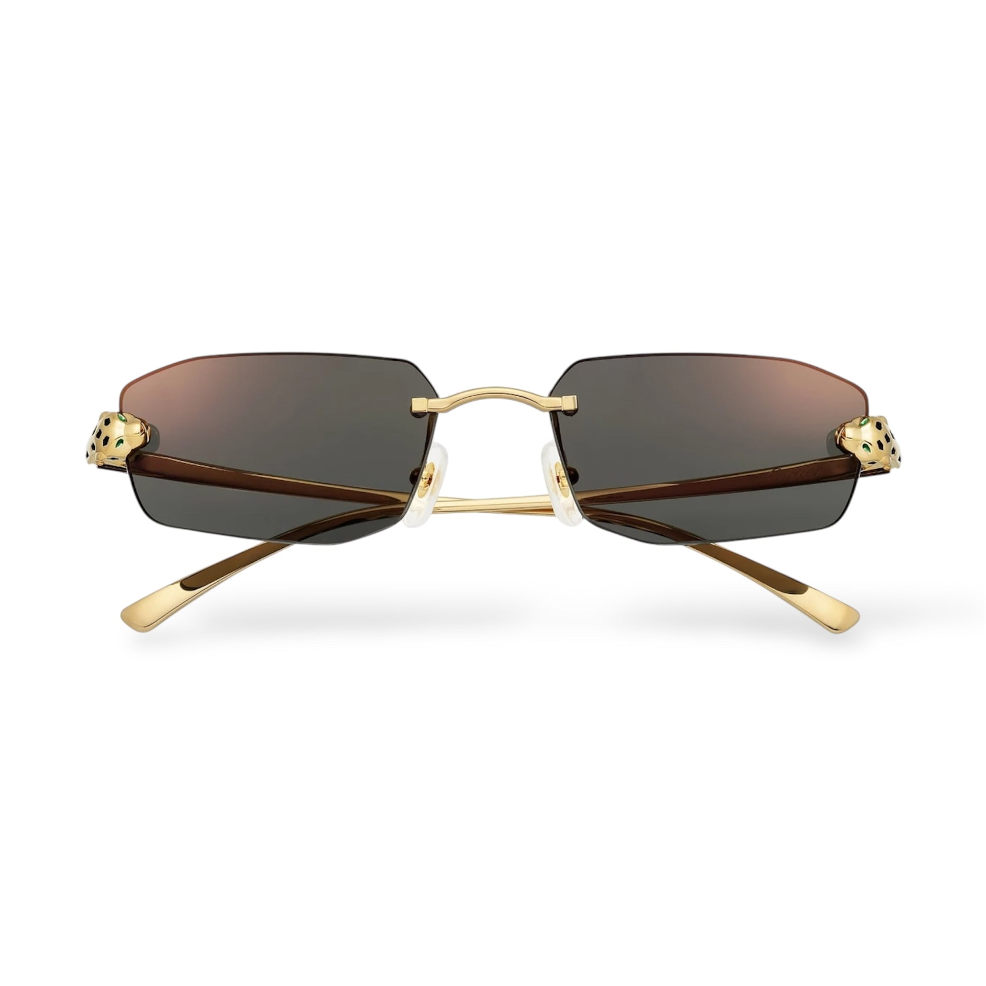 Bold elegance in a timeless silhouette. These rimless Cartier sunglasses feature a smooth golden metal finish, rectangular shape, and grey lenses with a golden mirror effect. Finished with the Maison’s iconic panther detail at the temples — refined, powerful, and unmistakably Cartier.