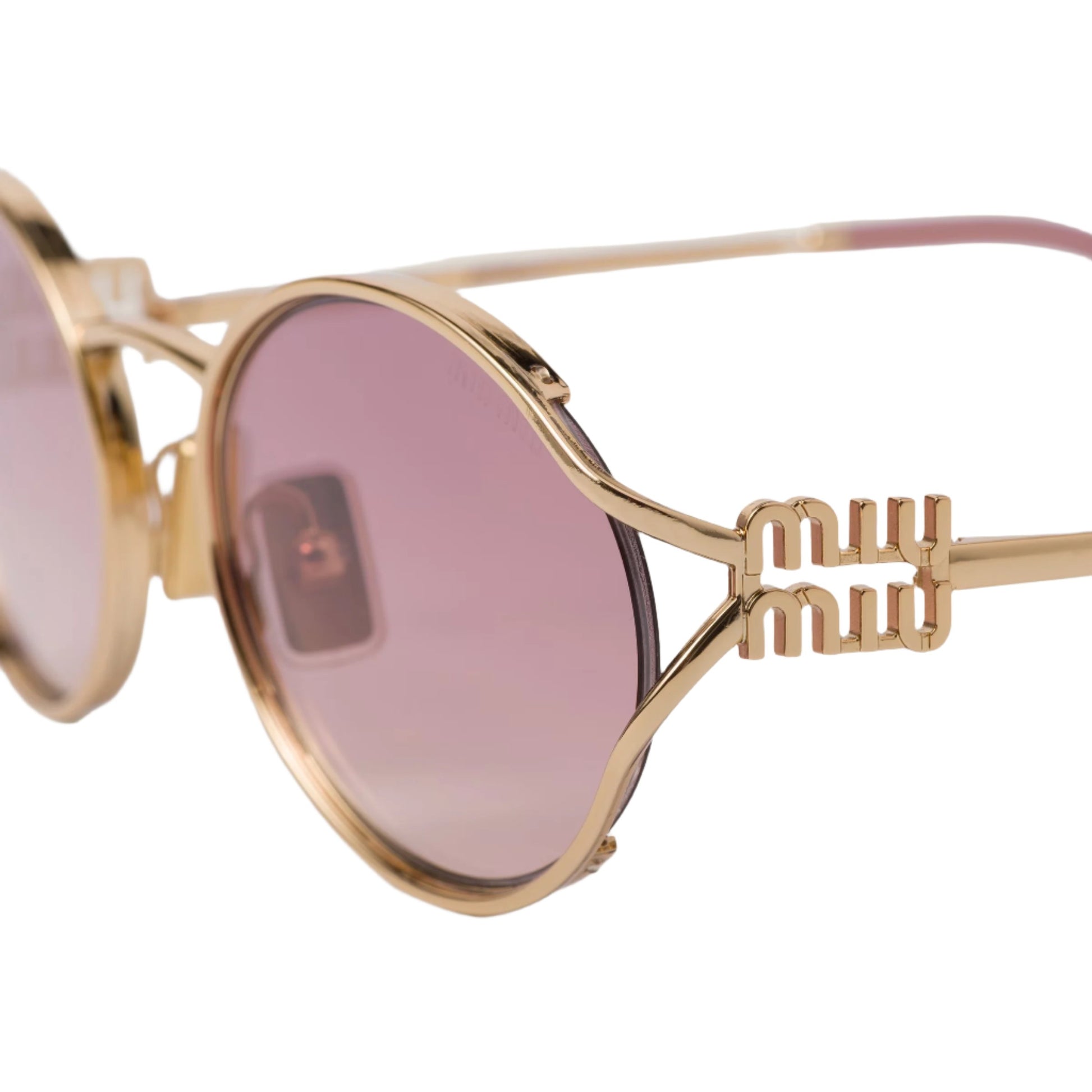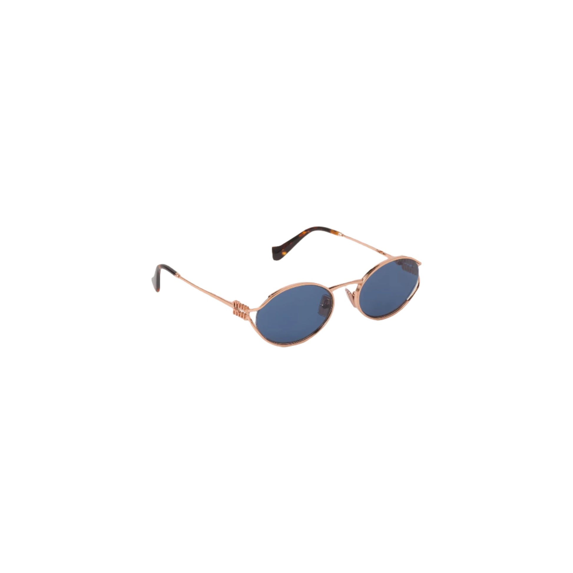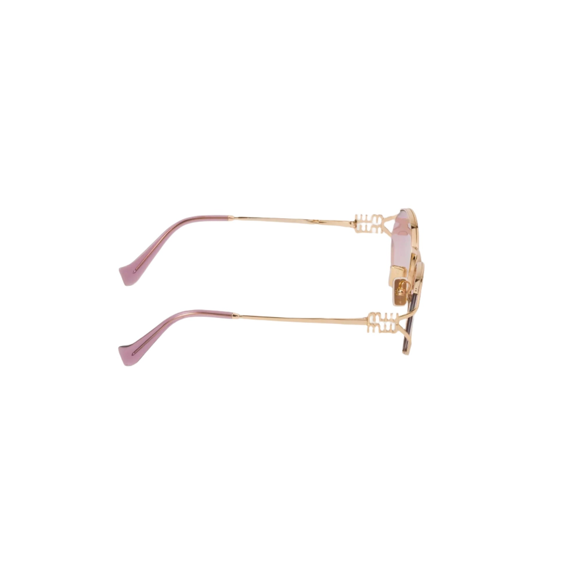 These metal sunglasses combine sophisticated femininity with a modern touch. The oversized frame is highlighted by slender metal rims that subtly separate from the wide flat lenses, meeting at the new Miu Miu vertical logo, seamlessly integrated into the straight temples.